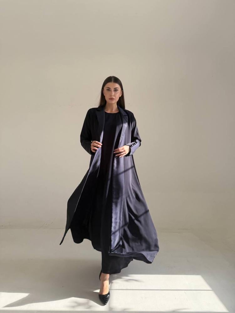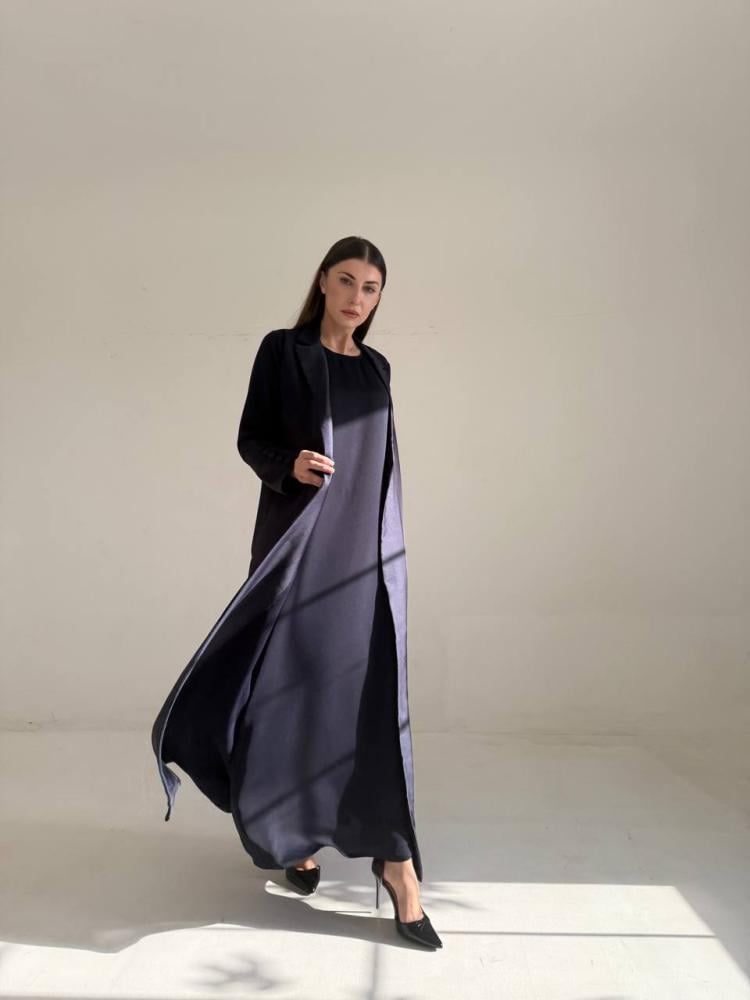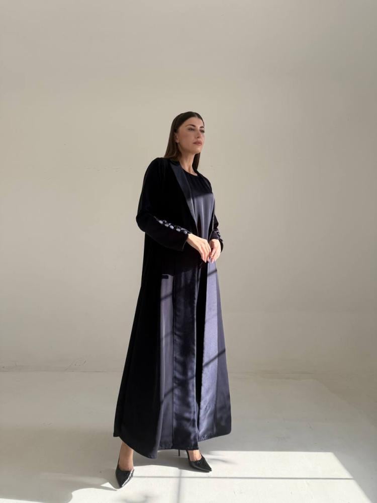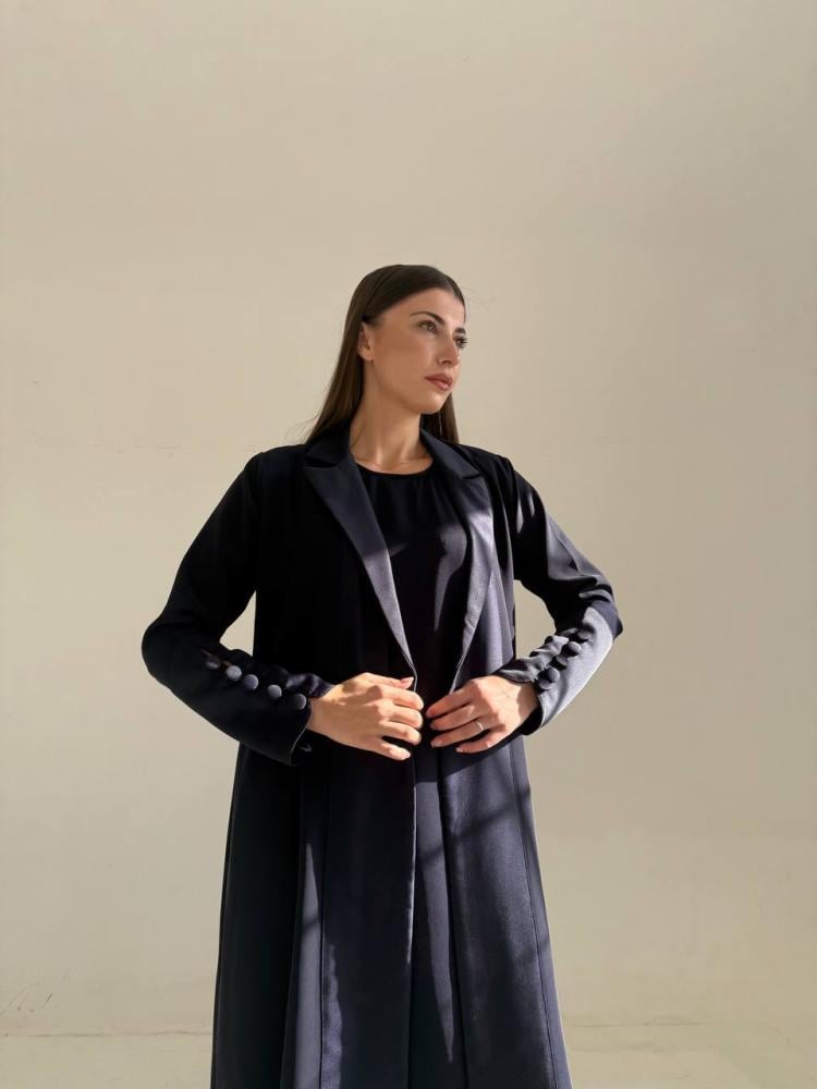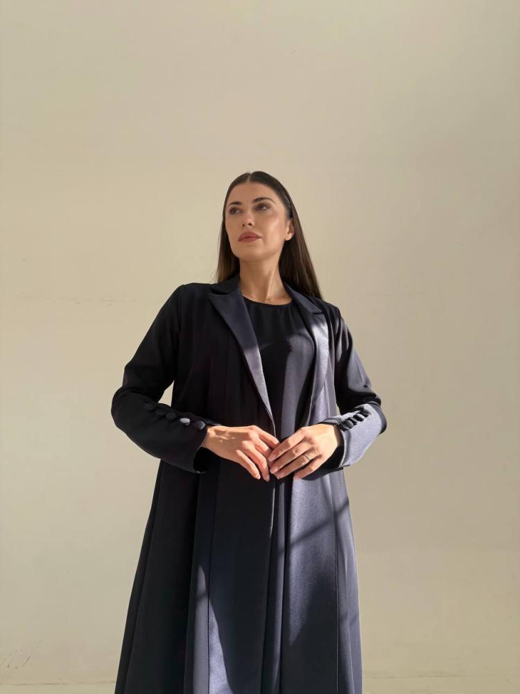 عباية بتصميم راقي وكلاسيكي بقصة رسمية، مصنوعة من أجود خامات الكريب مع الحرير. قصة العباية رسمي كلوش باللون الكحلي.