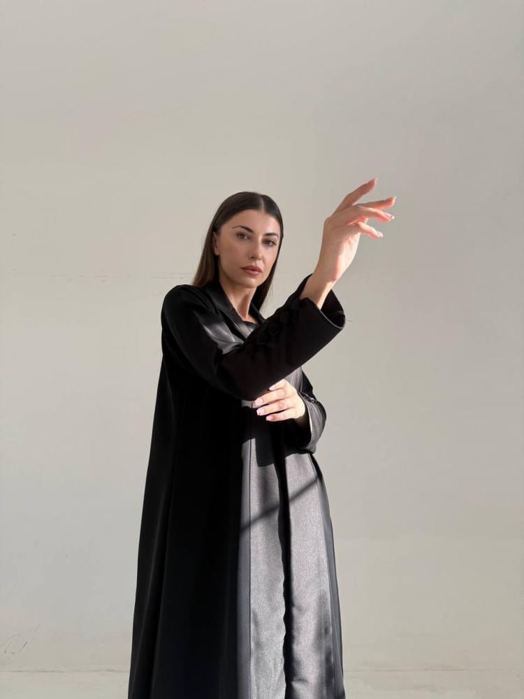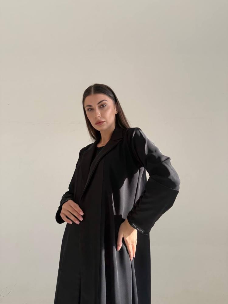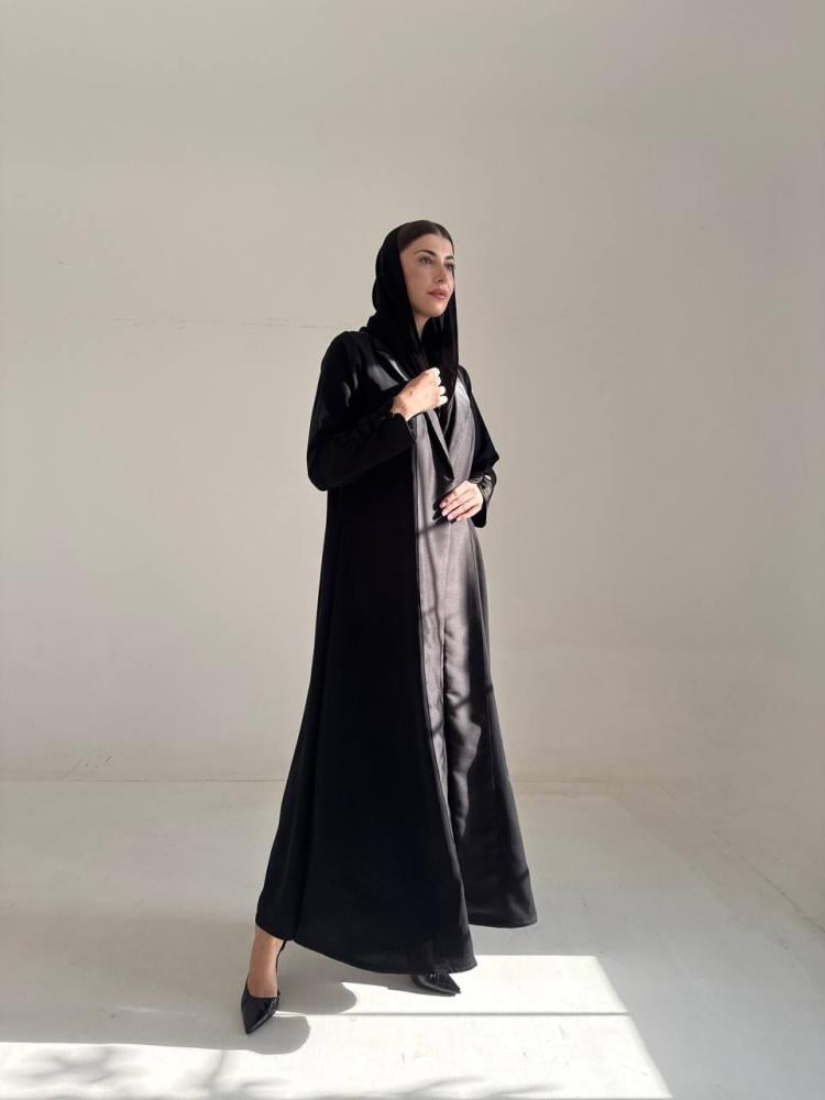 عباية بتصميم راقي وكلاسيكي بقصة رسمية، مصنوعة من أجود خامات الكريب مع الحرير. قصة العباية رسمي كلوش باللون الأسود.