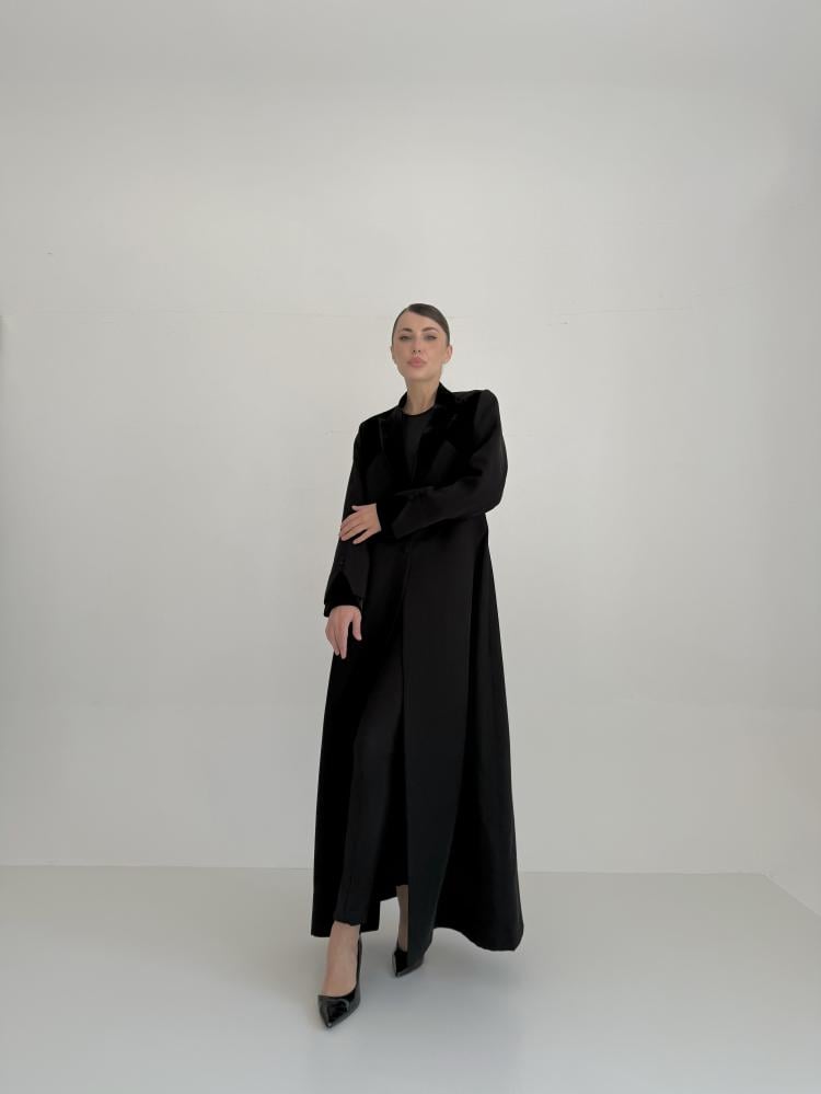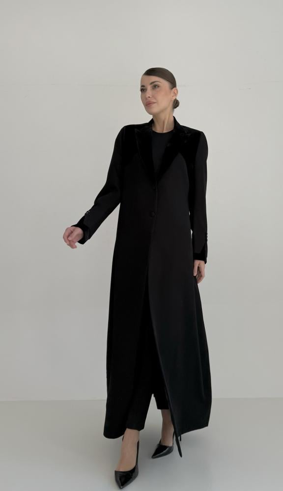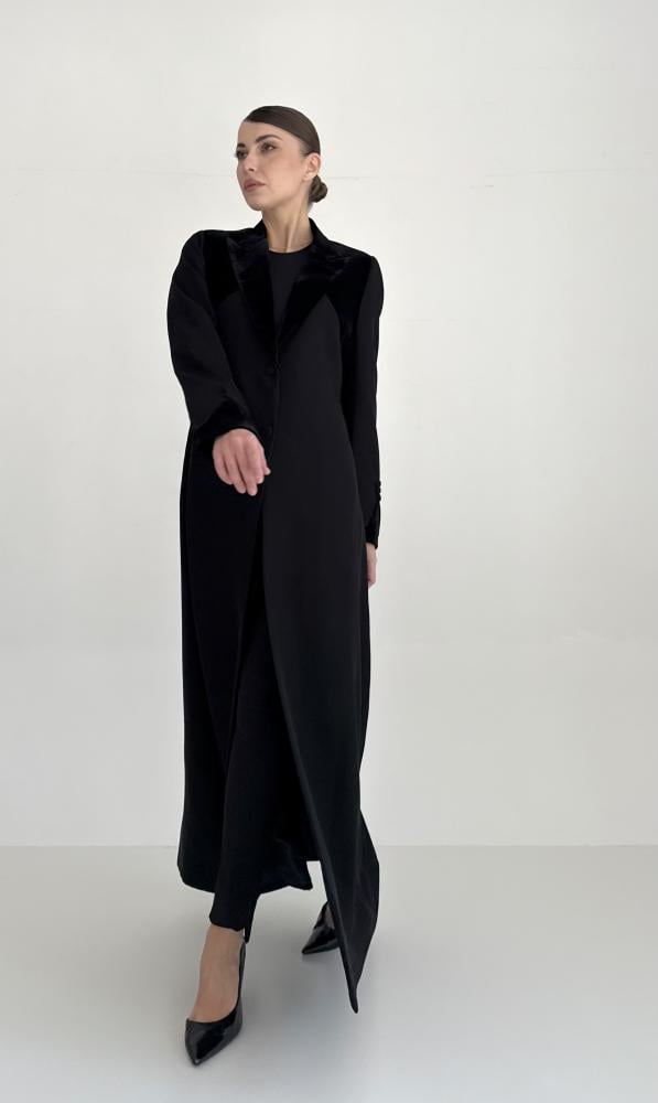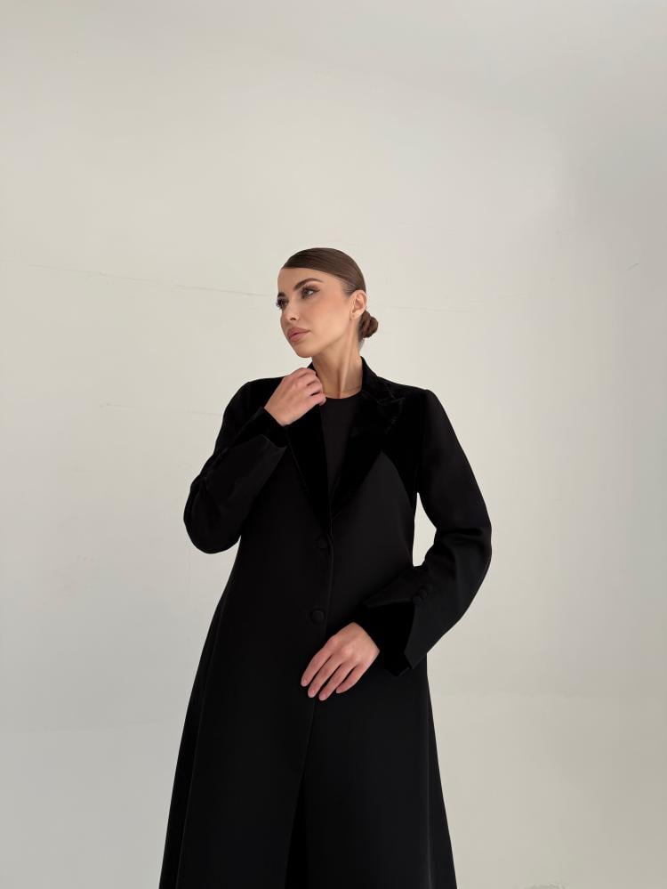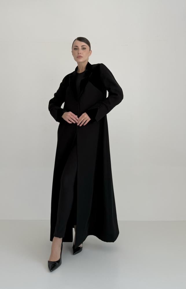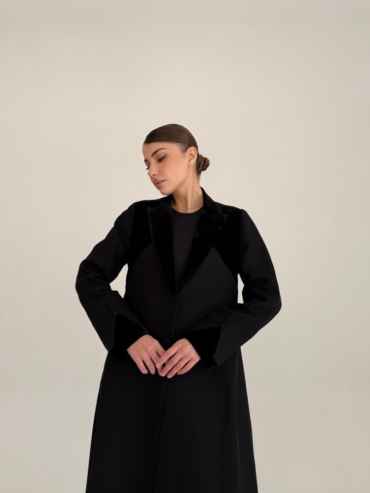 عباية شتوية بقصـة البليزر الرسمية تجمع بين قماش المخمل الكوري والكريب باللون الأسود. مصممة بأسلوب أنيق وبسيط لتناسب المناسبات والاستخدام اليومي.