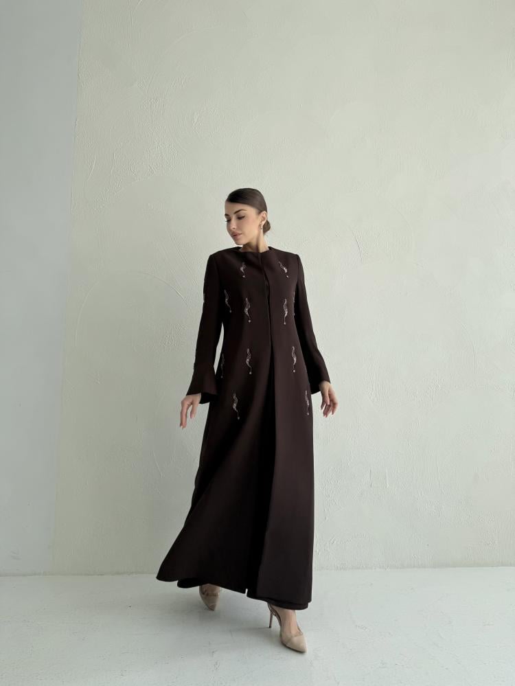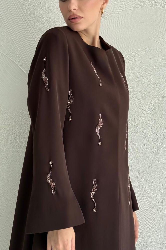 عباية أنيقة بقصة البليزر ، مصنوعة من قماش الكريب باللون البني، ومزينة بتطريز يدوي، بتصميم خاص وكمية محدودة