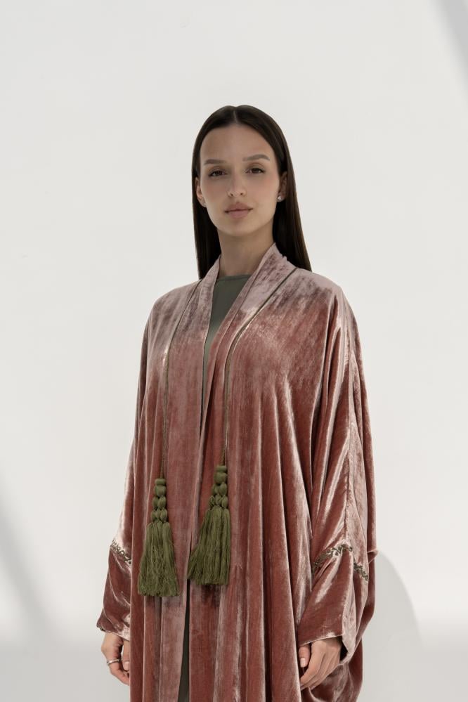 عباية بتصميم أنيق وراقي مصنوعة من أجود الأقمشة المخمل الطبيعي باللون الوردي وبتطريز راقي بالأكمام والطرحة