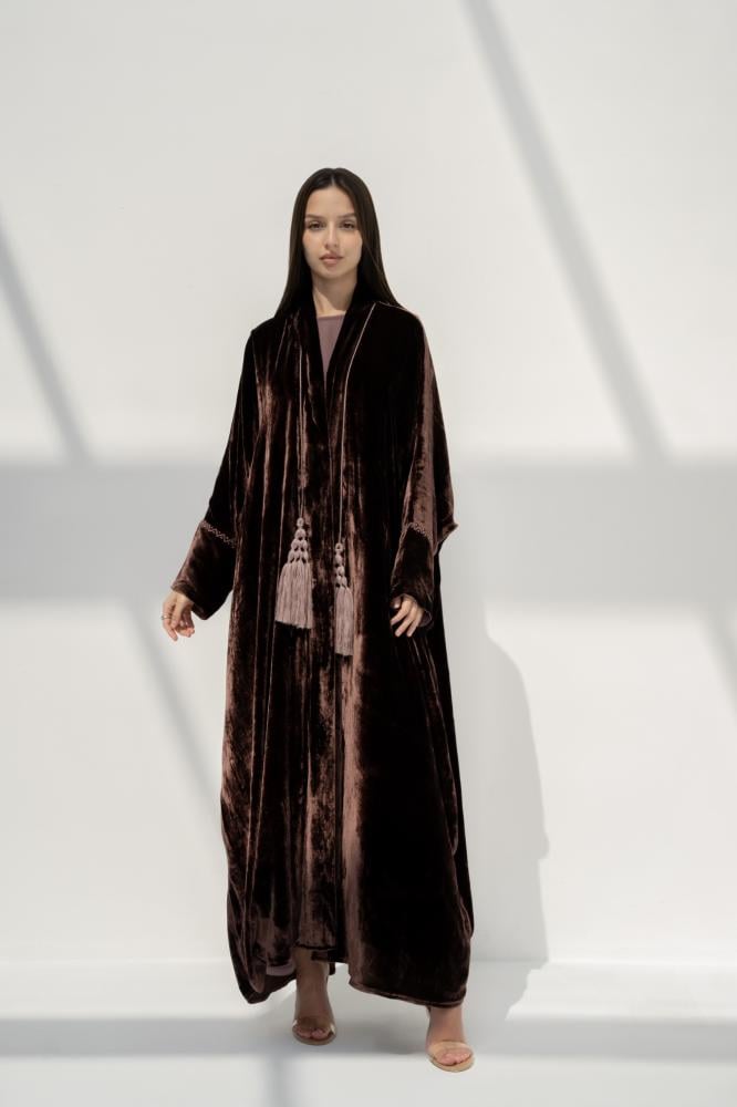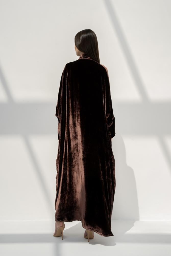 عباية بتصميم أنيق وراقي مصنوعة من أجود الأقمشة المخمل الطبيعي باللون البني وبتطريز راقي بالأكمام والطرحة